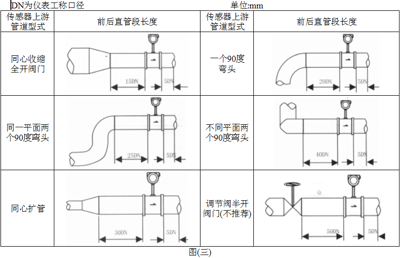 1. 渦街流量?jī)x表對(duì)安裝點(diǎn)的上下游直管段有一定要求,否則會(huì)影響介質(zhì)在管道中的流場(chǎng),影響儀表的測(cè)量精度。儀表的上下游直管段長(zhǎng)度要求見(jiàn)圖(三)